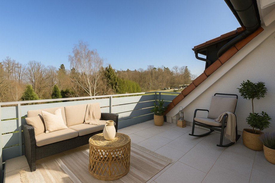 Der lichtdurchflutete Wohnbereich bietet direkten Zugang zu einem Balkon, von dem aus sich ein weiter Blick auf das wunderschön eingewachsene, grüne Grundstück eröffnet - ein perfekter Ort, um Ruhe und Natur zu genießen. Die gut geschnittene Küche, ein gemütliches Schlafzimmer sowie ein weiteres Zimmer auf der unteren Ebene bieten viel Raum zur individuellen Gestaltung. Das Dachstudio besticht durch seine Großzügigkeit und vielfältige Nutzungsmöglichkeiten - ob als Arbeitsbereich, Rückzugsort oder Atelier.